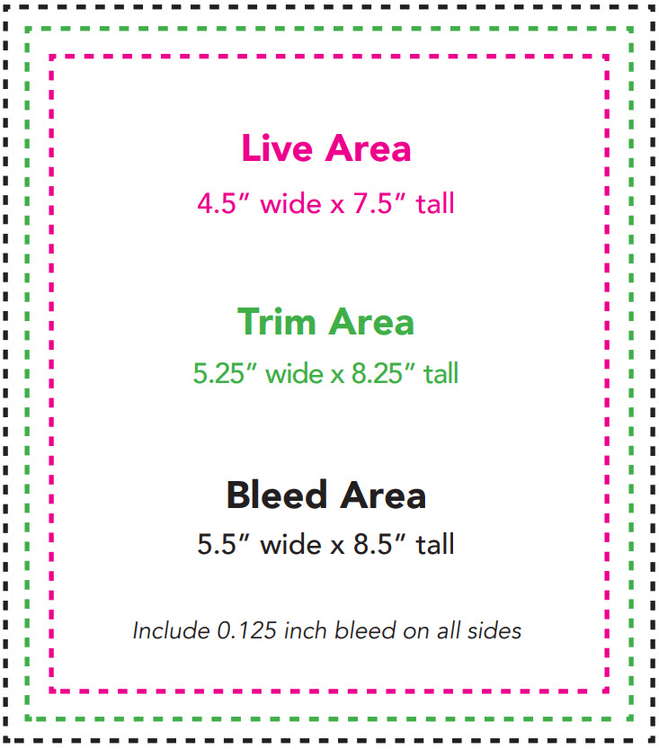 Bleed area: 5.5 inches wide by 8.5 inches tall (additional .125 inch each side)