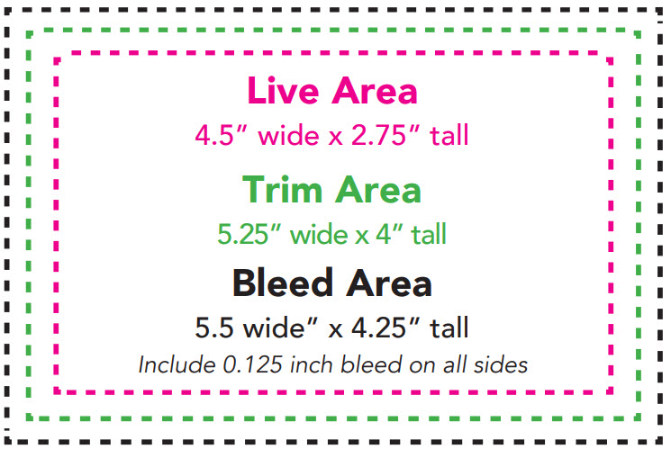 Bleed area: 5.5 inches wide x 4.25 inches tall (Add up to .125” bleed on all sides)